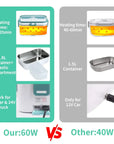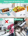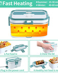 Introducing our 3-in-1 Electric Lunch Box, a convenient solution for those who are always on the go! This versatile lunch box supports 110V/220V for home/office use, 12V for car use, and 24V for truck use. Enjoy hot meals anytime, anywhere. With an upgraded 60W power supply, our electric heating lunch box heats up in just 25-35 minutes. The circulating heat design ensures your food stays nutritious and fresh. Four-sided snaps and a built-in rubber seal make this lunch box leak-proof, eliminating worries about soup leakage. Ideal for office employees, construction workers, truckers, and anyone who prefers homemade meals. The stainless steel container has a generous 1.8L capacity, ensuring you won't go hungry. Additionally, a 0.45L plastic compartment allows you to separate different kinds of food. The included insulation bag protects your lunch box from rain and dust, making it easy to carry. Please note that the electric lunch box should not be submerged in water. If taken from the fridge, extend the heating time accordingly.